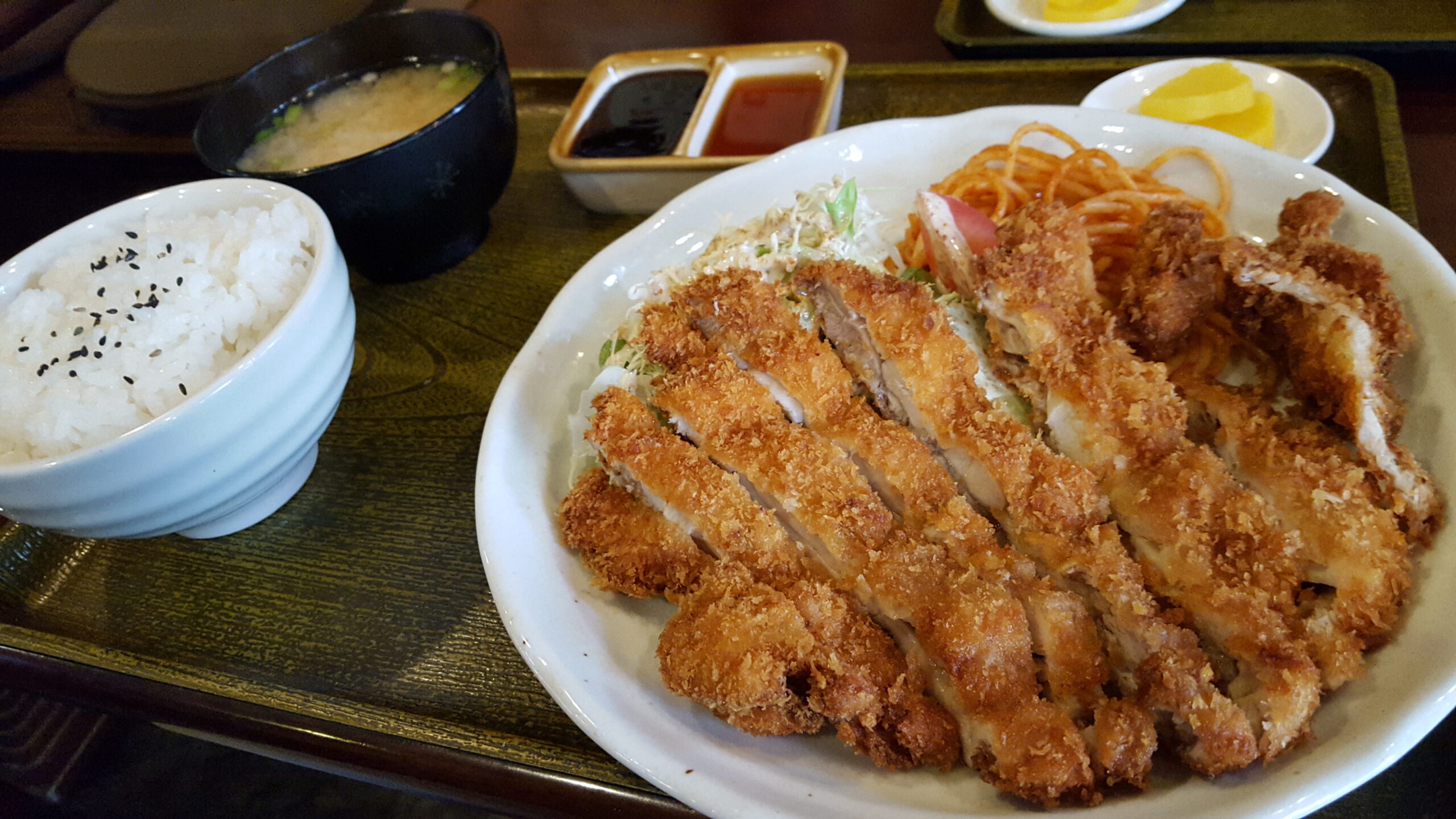 ランチは向かい岸の喫茶店で、名物のチキンカツ定食。